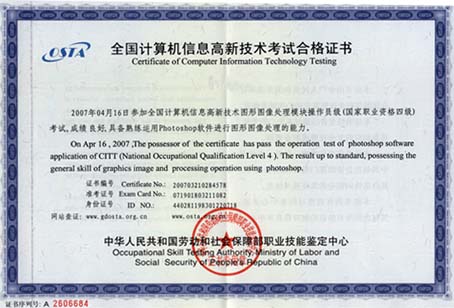 中华人民共和国信息产业部《技术资格证》、中华人民共和国劳动和社会保障部《 职业资格证》、中华人民共和国教育部《全国计算机等级证》。——考证费另收,不考不用交